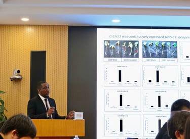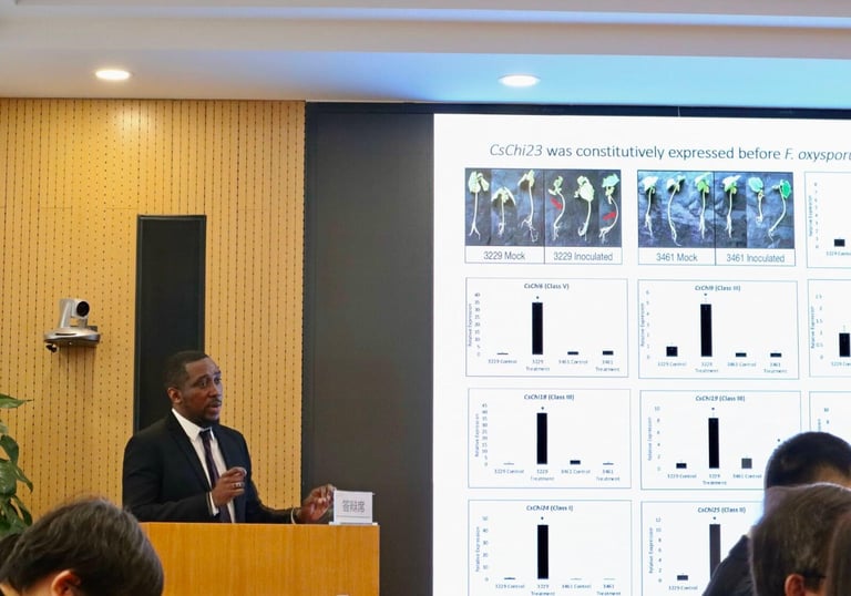 Molecular crop breeder, Dr. Ezra Bartholomew, presenting new research findings at China Agricultural University and several Chinese Biotechnology companies for a disease-resistant cultivar of cucumber.
